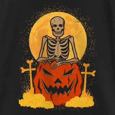 - Strut your stuff with this stylish new Halloween girls’ t-shirt that is perfect for the trick-or-treating season! Featuring a creepy skeleton leaning on an evil jack-o’-lantern with a full moon in the background and two crosses.