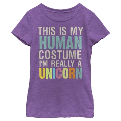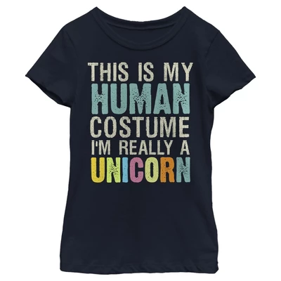Who says you have to dress up for Halloween? Have a little fun with this Lost Gods Girl’s Tee that says: “This is my Human Costume I’m Really a Unicorn” in bold colorful lettering.