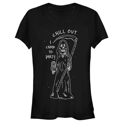 Relax! This hilarious Juniors’ Tee features a sketch of a Grim Reaper with a can in his hand with “Chill Out I Came to Party” written above.
