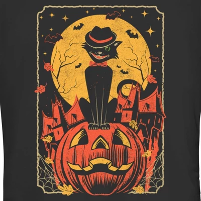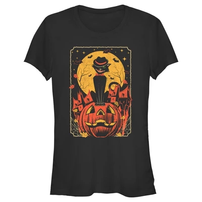 - Strut your stuff with this stylish new Halloween juniors’ t-shirt that is perfect for the trick-or-treating season! Featuring a black cat standing on top of a jack-o’-lantern with a full moon and hunted mansion in the background.