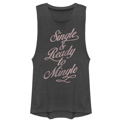 Get in the Valentine’s Day mood with this officially licensed Juniors’ Charcoal Lost Gods Single & Ready to Mingle Festival Muscle Tank Top! Featuring the words “Single & Ready To Mingle” in big cursive letters, you are sure to attract a cute Valentine this season! Dress in style with this new graphic tank top today!