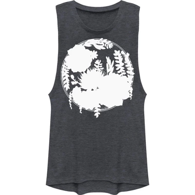 Take your everyday style to the next level with this lovely new Juniors’ Festival Muscle Tank Top from Lost Gods! This easy-breezy denim heather tank features a circle full of different types of succulents and floral branches printed in white colors across the front. Grab this new graphic tank top today and make everything from workouts to running errands, or even just lounging around the house a little extra chic!
