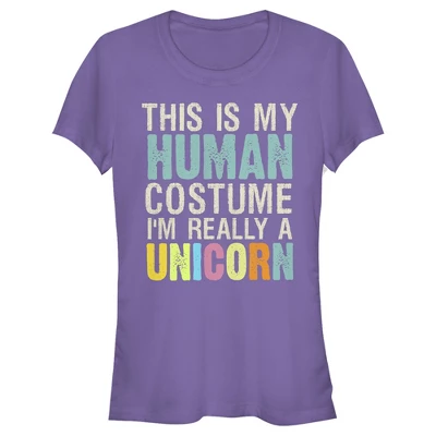 Who says you have to dress up for Halloween? Have a little fun with this Lost Gods Juniors’ Tee that says: “This is my Human Costume I’m Really a Unicorn” in bold colorful lettering.