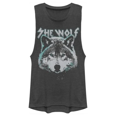 - Strut your stuff with this stylish new Juniors’ graphic Muscle Tank that is perfect for every occasion! Featuring a cool wolf graphic and the phrase “She wolf”.