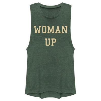 - Strut your stuff with this stylish new everyday Juniors’ Festival Muscle Tank Top that is perfect for every occasion! Featuring a distressed text that reads: “Woman Up” in yellow letters adorned across the front.