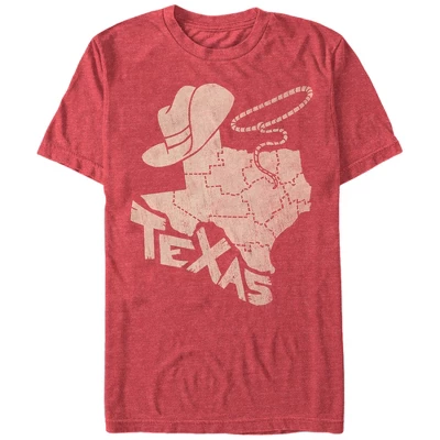 Lasso yourself the Lost Gods Lasso Texas State Heather Red T-Shirt! This cool red Texas shirt features the state wearing a cowboy hat and a lasso with “Texas” along its border in a distressed print down the front.