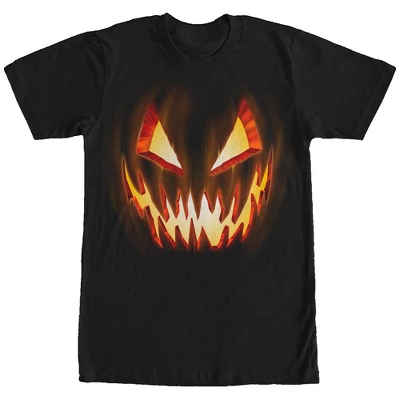 - A scary jack-o’-lantern with jagged teeth is printed in a glowing style on this men’s t-shirt.