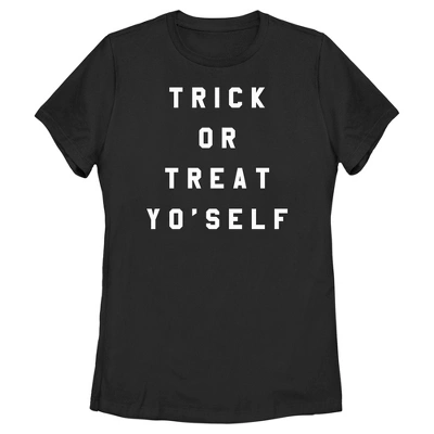 - Strut your stuff with this stylish new Halloween women’s t-shirt that is perfect for the trick-or-treating season! Featuring the text: “Trick Or Treat Yo’ Self,” across the front.