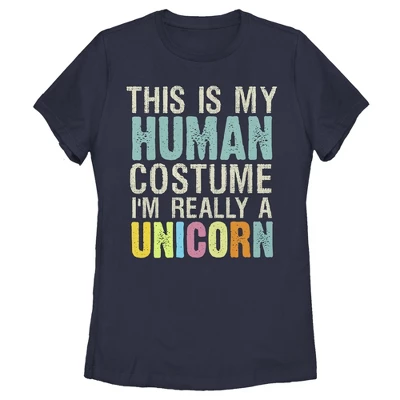 Who says you have to dress up for Halloween? Have a little fun with this Lost Gods Women’s Tee that says: “This is my Human Costume I’m Really a Unicorn” in bold colorful lettering.